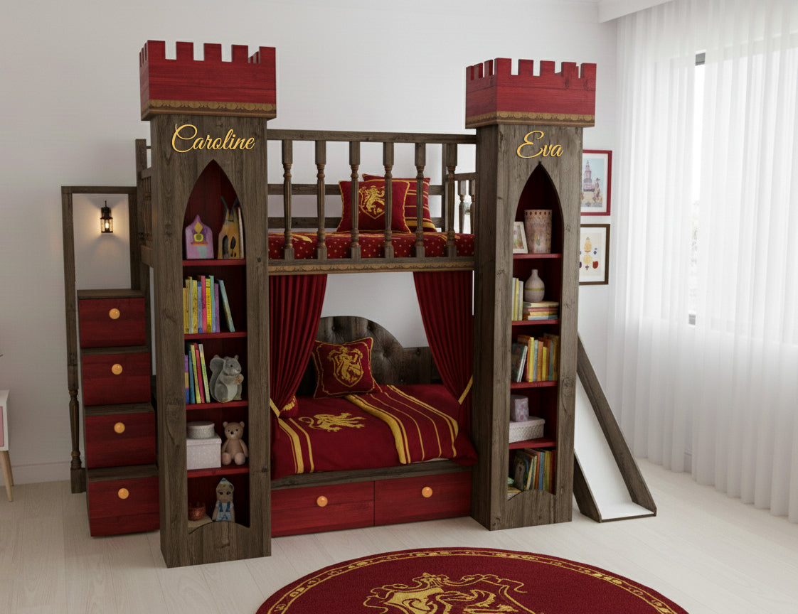 Łóżko w kształcie zamku księżniczki ze zjeżdżalnią